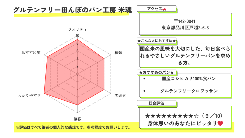グルテンフリー田んぼのパン工房 米魂は、国産米を使った米粉パン作りに強いこだわりを持つ、品川エリアのグルテンフリーパン専門店です。