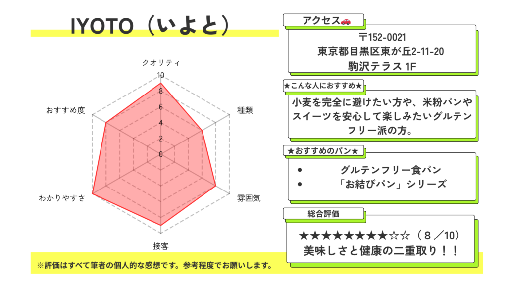 IYOTO(いよと)の大きな魅力は、駒沢大学駅から徒歩約2分という通いやすい立地と、すべての商品が完全グルテンフリーで提供されている安心感です。