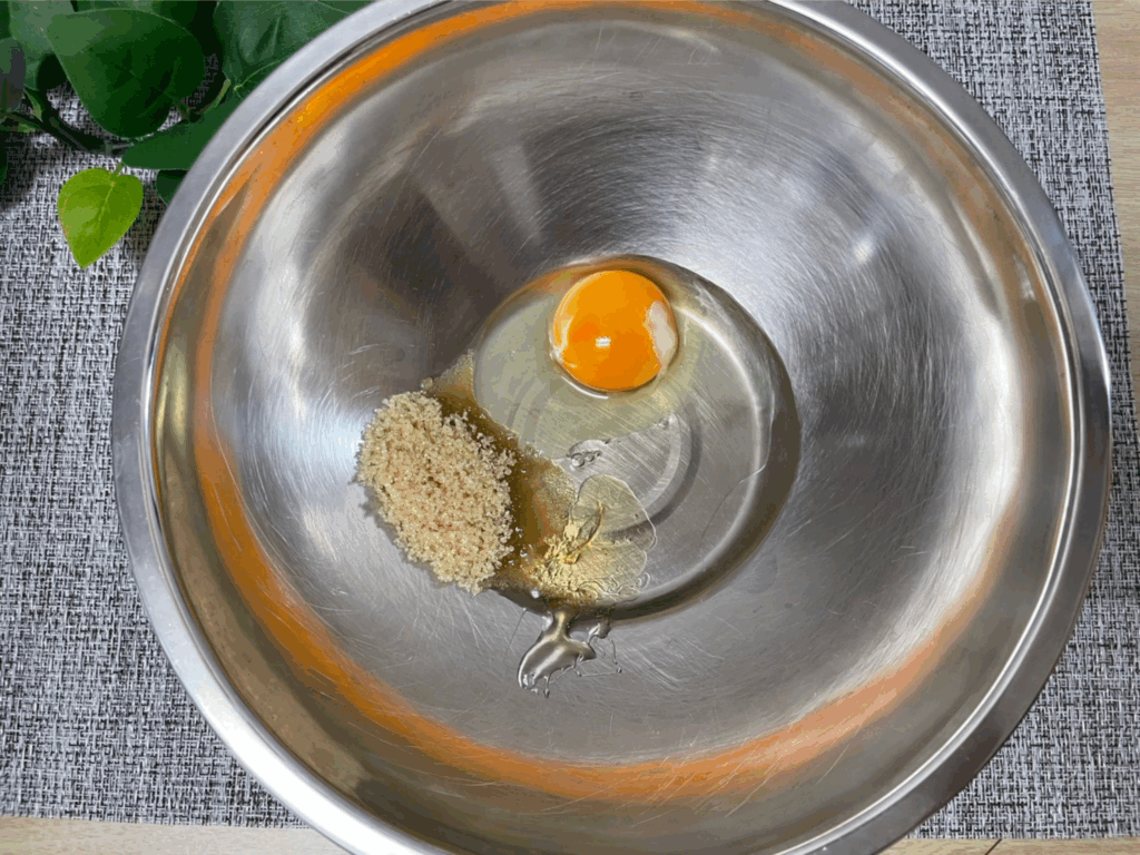 ボウルに卵1個、きび砂糖25g、はちみつ大さじ1/2、こめ油大さじ2と1/2を入れて混ぜます。こめ油はサラダ油や香りの無い白ゴマ油などで代用できますよ!きび砂糖も上白糖やてんさい糖などで代用可能です。