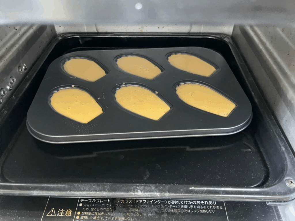 下準備で油を塗った型に生地を流し入れます。180℃に予熱したオーブンで10分焼きます。焼き色を見て焼き時間は調節してください。