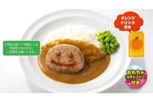こちらのメニューは、先ほどの「低アレルゲンハンバーグカレープレート」とほとんど同じ内容になってますが、違う点が①ゼリーがないこと、②おもちゃ(ガチャコイン)付きになっています。
