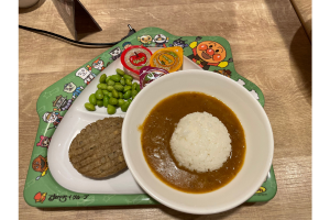 配膳されたプレートは、アンパンマンのお皿で見た目も子どもの興味を引く構成。ご飯とカレーがメインに、ハンバーグ・枝豆・ゼリー・ジュースがバランスよく配置されていました。我が家が利用した店舗ではなかったですが、枝豆を子どもの安全性を考慮して、半分割して提供してくれる店舗があるらしいので、一度店員さんに確認してみてもいいかもです(^^♪