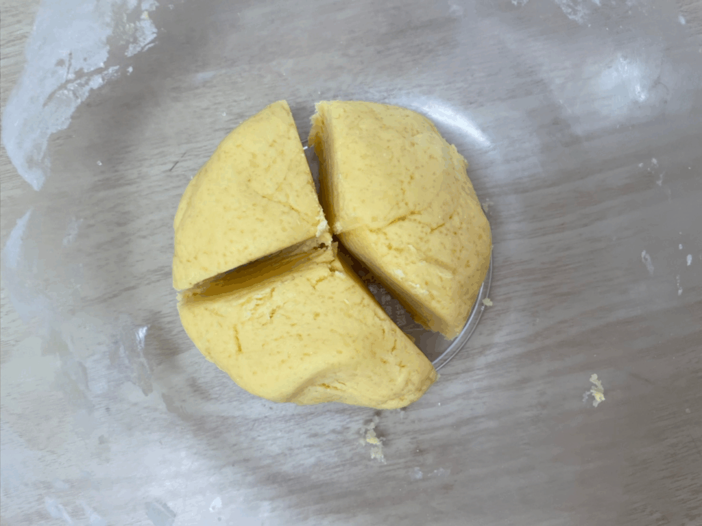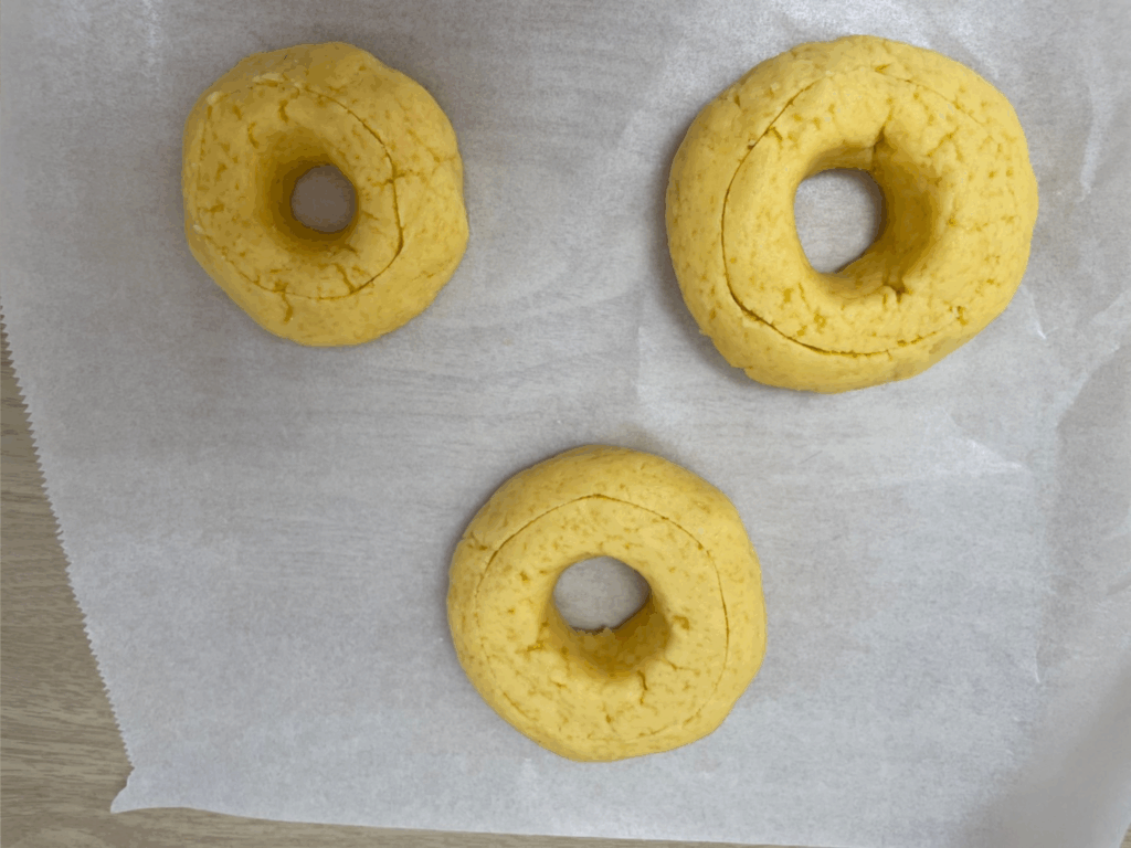 生地が混ざったら3つに分けて、ドーナツの形を作ります!