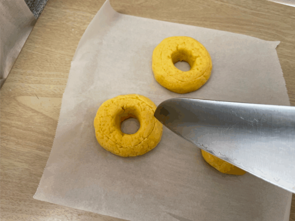 ドーナツの形になった生地に、包丁で飾りをつけます。これをすることで、焼きあがったときにオールドファッション感が高まります☺