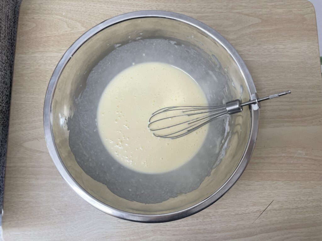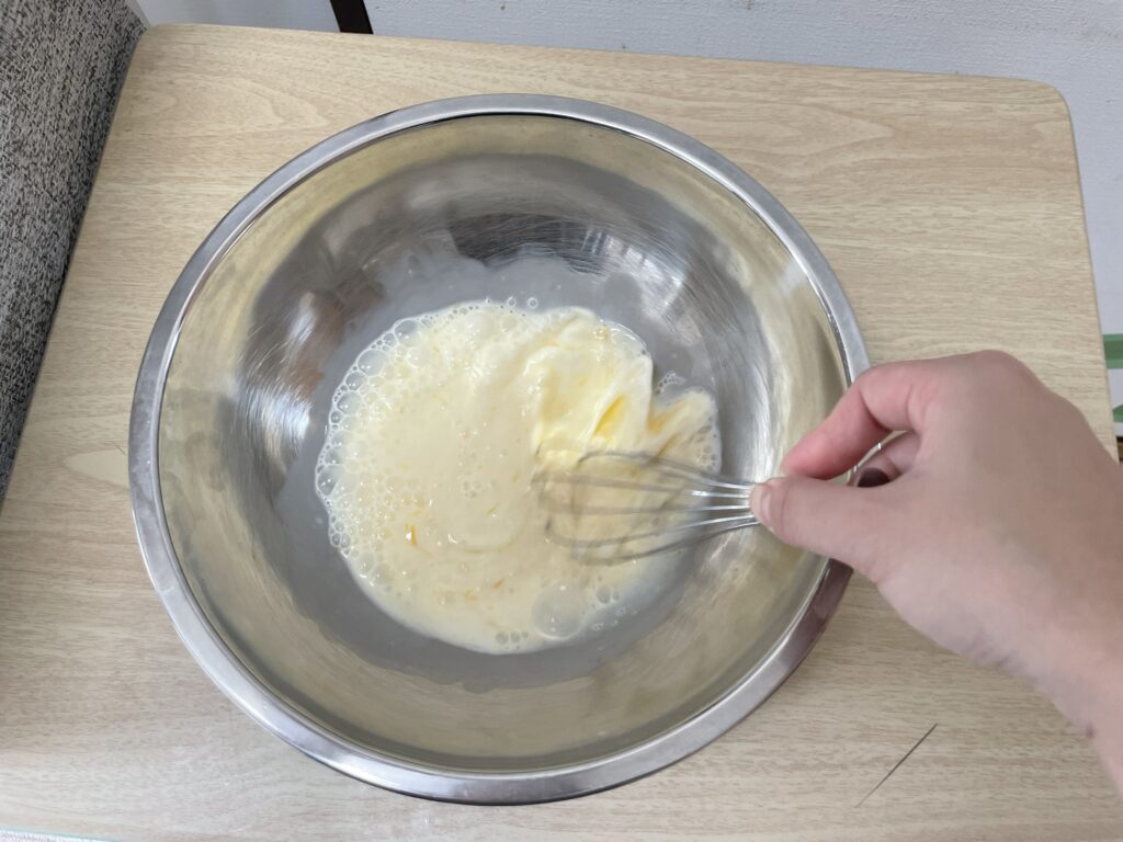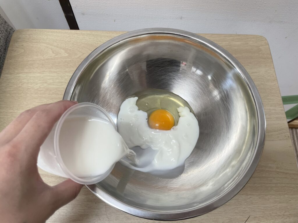 卵と牛乳をボウルに入れて、泡だて器で混ぜる!