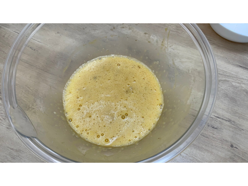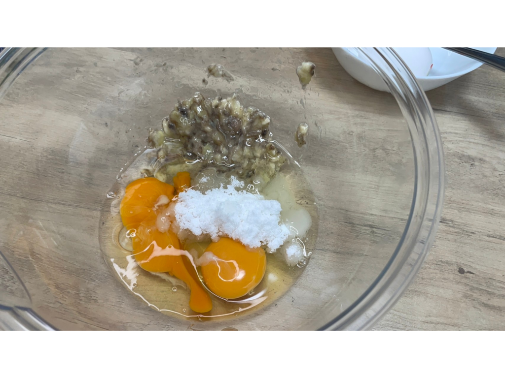 先ほどバナナを加熱したボウルに、たまご、砂糖、油を入れ、バナナをつぶしながら混ぜ合わせます。