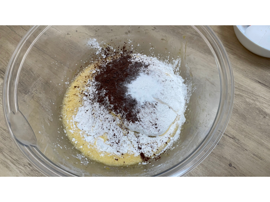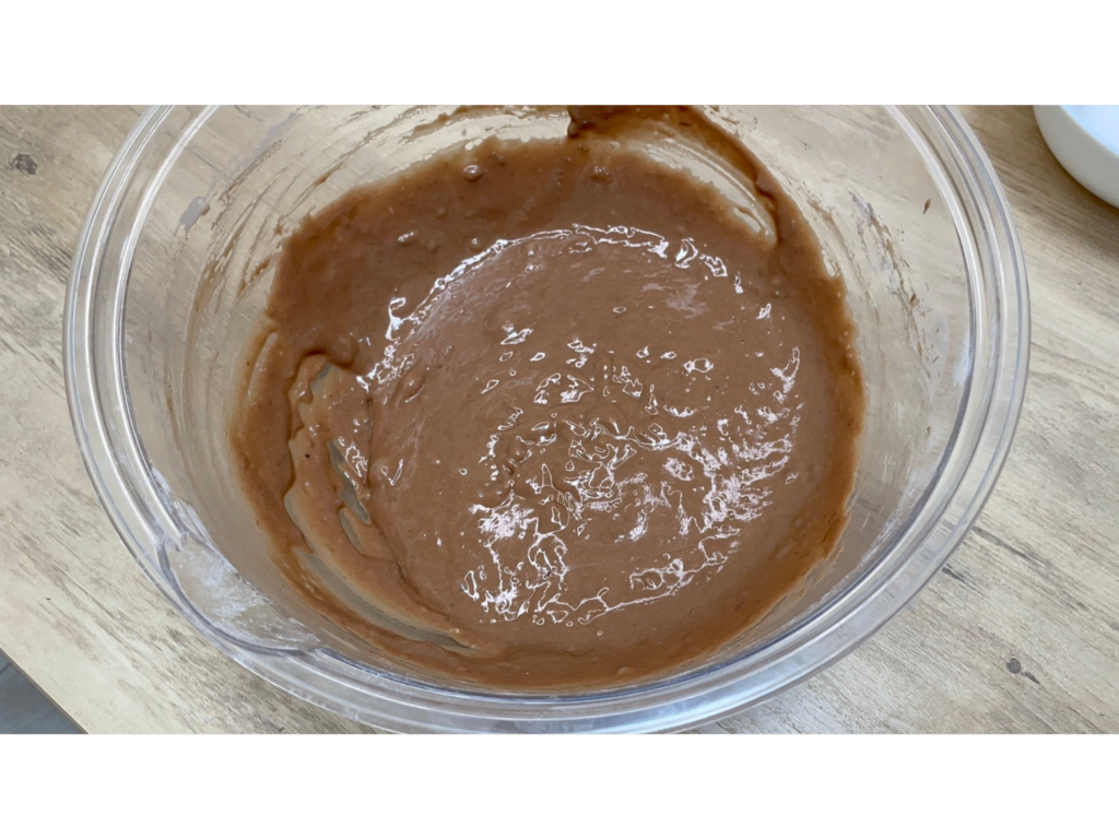 バナナが潰れ材料が混ざったら、そこに米粉、ベーキングパウダー、ココアパウダーを入れ、だまにならないように素早く混ぜます。