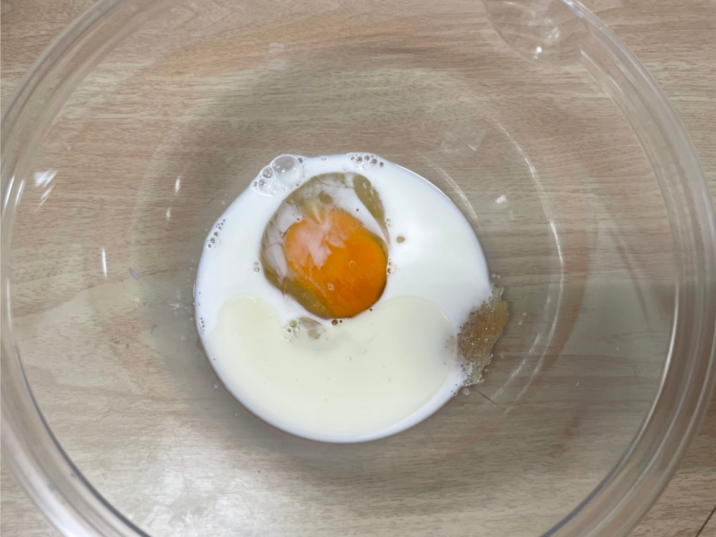 ボウルに、卵・豆乳・きび砂糖・こめ油・塩を入れて、泡だて器などで均一になるまで混ぜます。