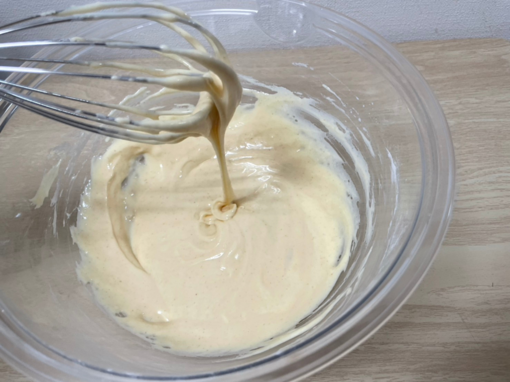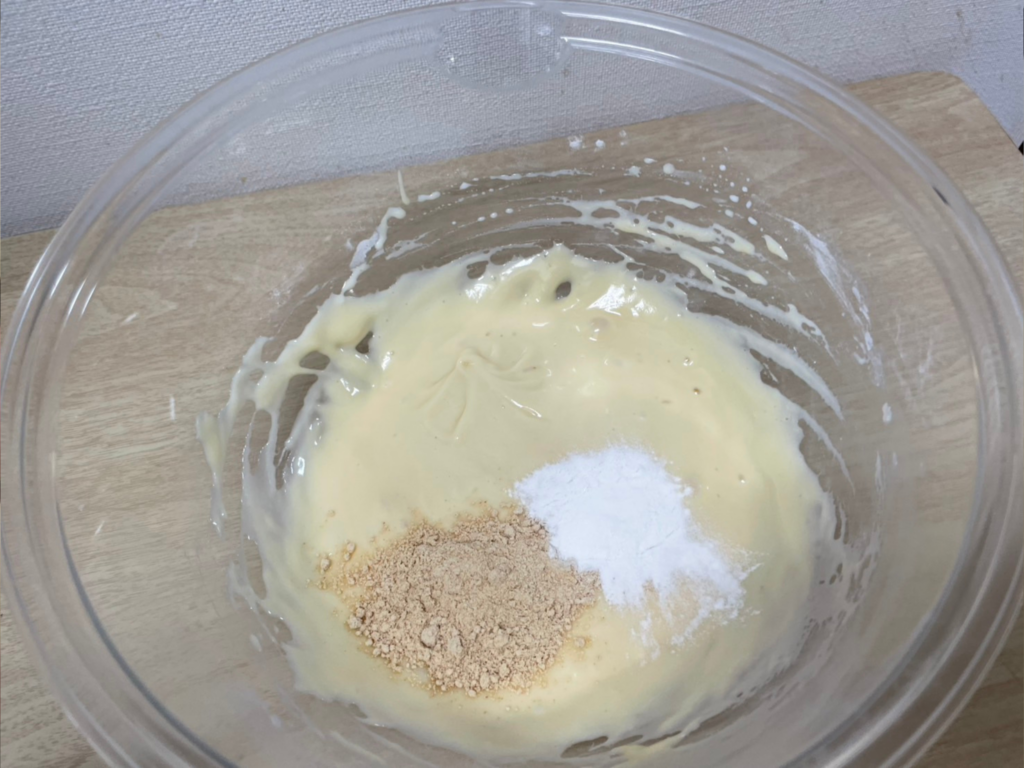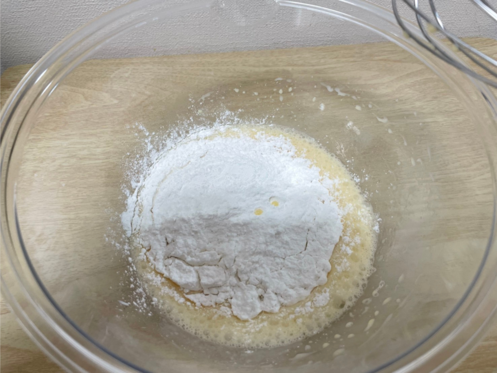 上記で混ぜたボウルに米粉・ベーキングパウダーを加えて、さらに混ぜ合わせます。