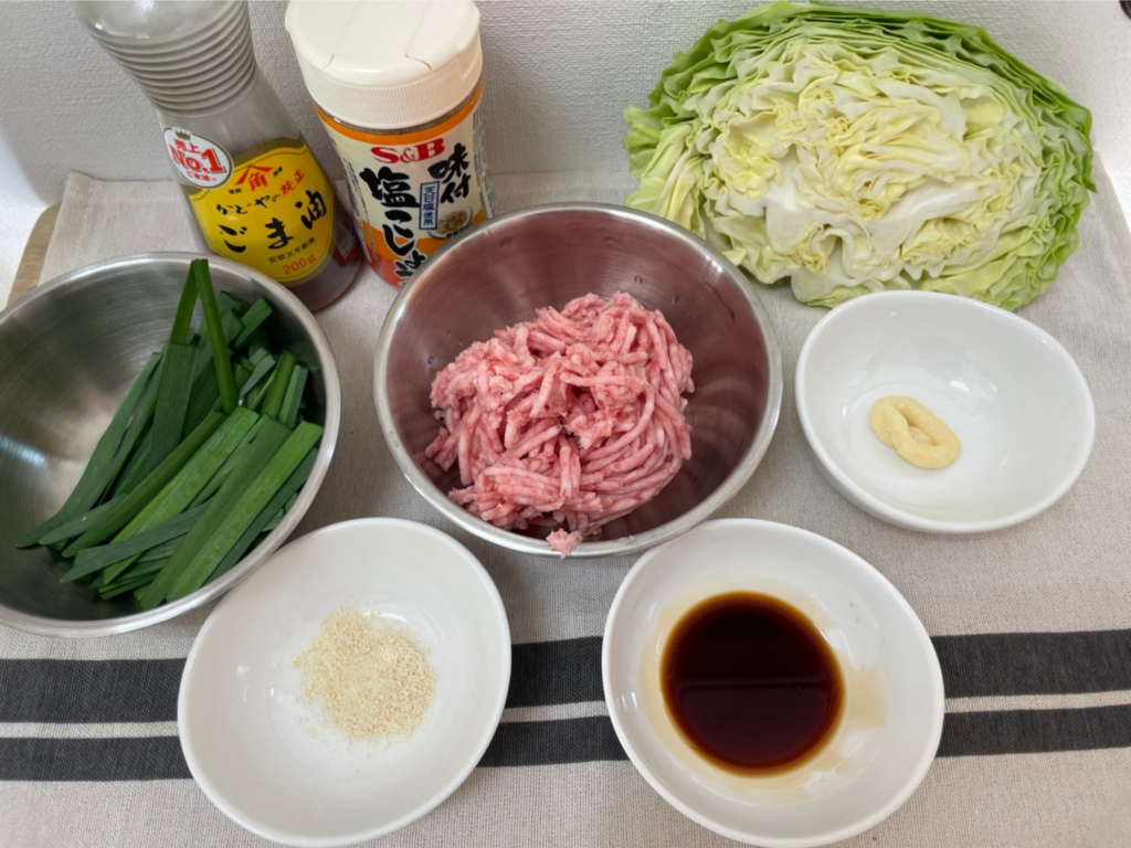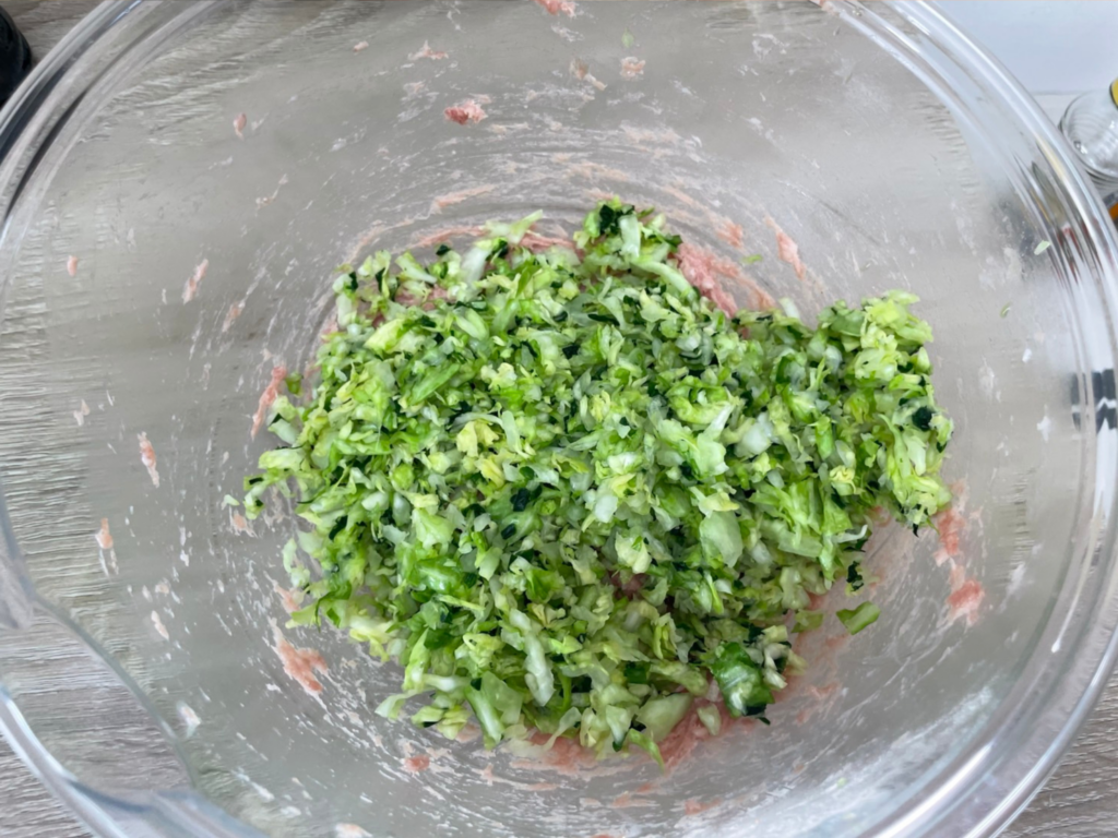 ひき肉に調味料を入れて混ぜたあんに、水抜きしたキャベツ、にらを入れて混ぜ合わせます。