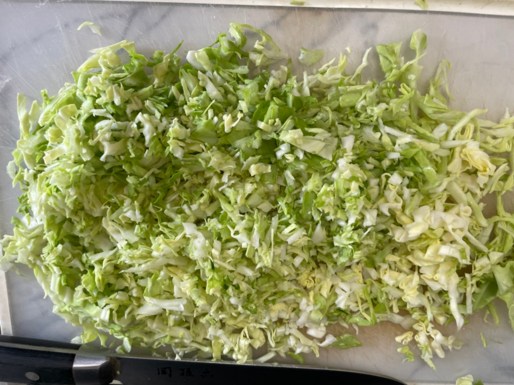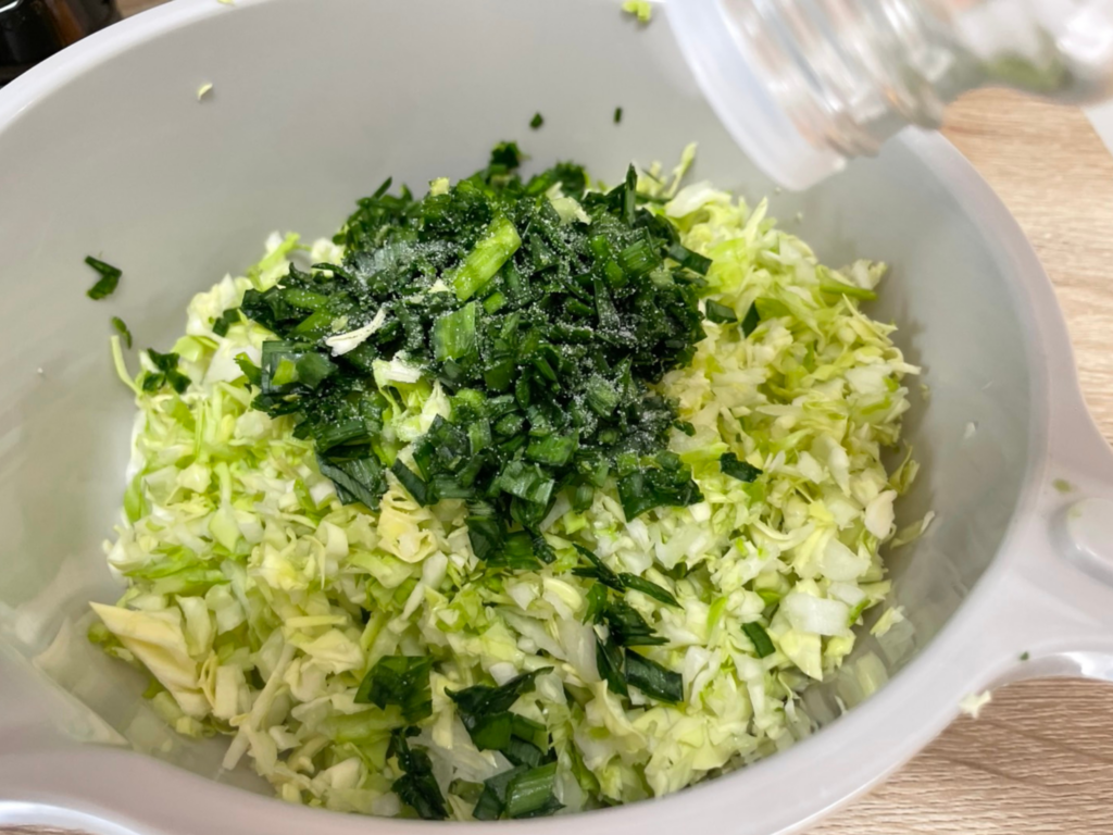 キャベツ、にらをみじん切りにして、キャベツはボウルに入れ塩を振って揉みこみ10分おきます。