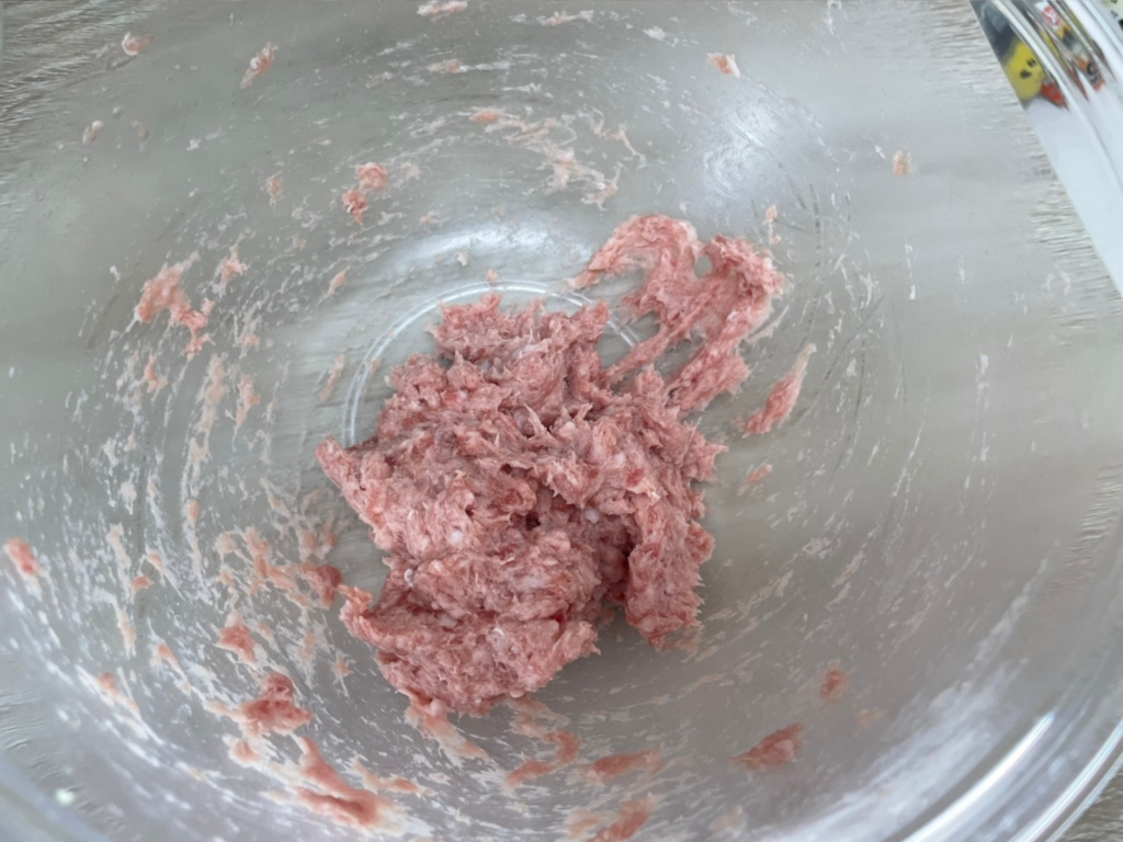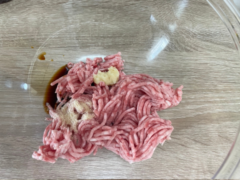 ひき肉をボウルに入れ、醤油、鶏ガラ、ショウガ、塩コショウ、ごま油をいれ、程よく練りこみます。