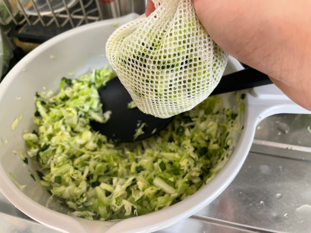 キャベツの水抜きをします。水抜きネットなどで絞り込みましょう!