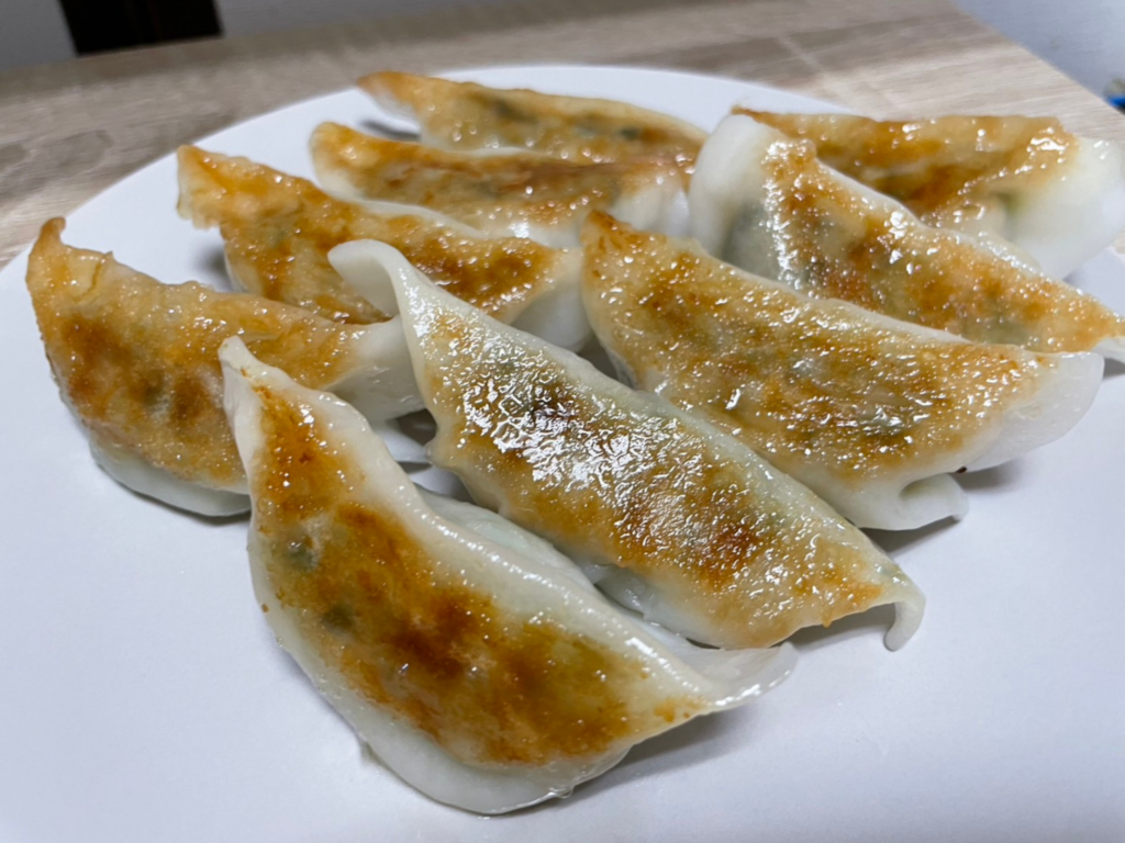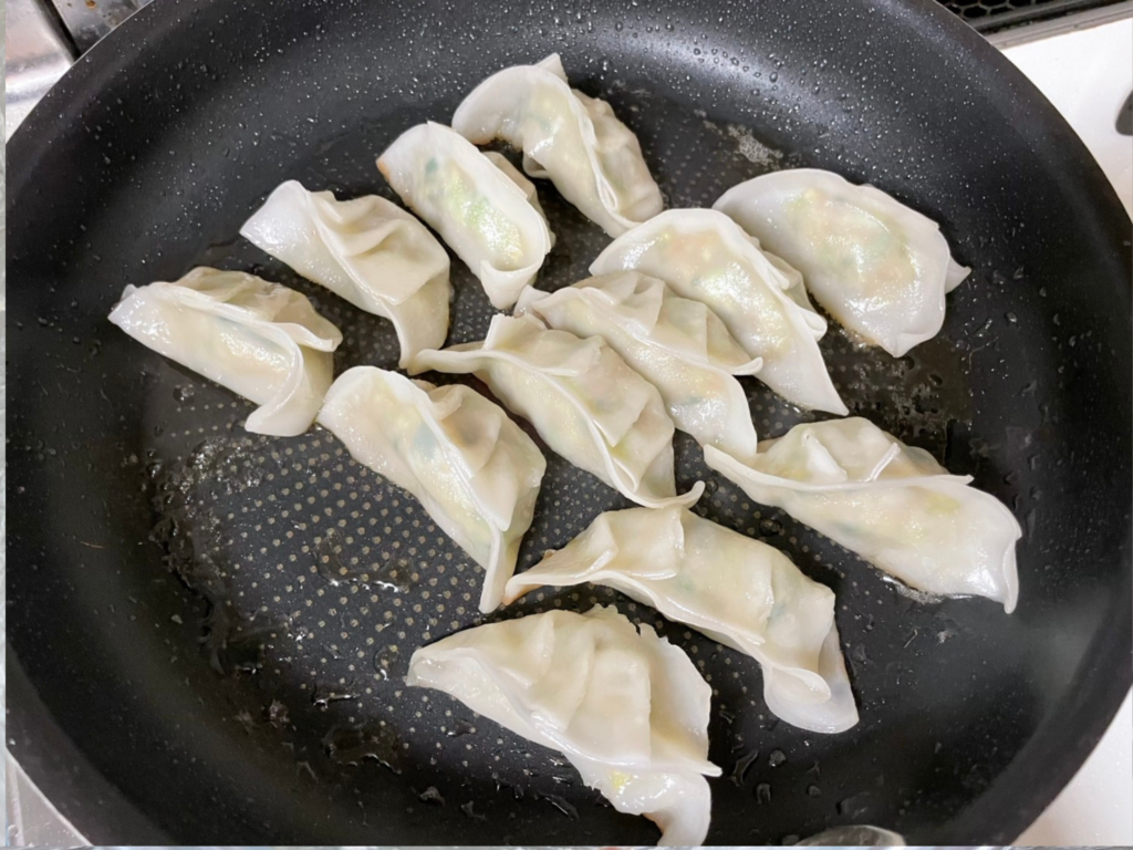 できた餃子をフライパンで加熱したら完成!焼き加減はお好みで☺羽根つきにしたい場合は、水溶き片栗粉を焼き上がり直前に加えてカリッと焼きあげましょう!