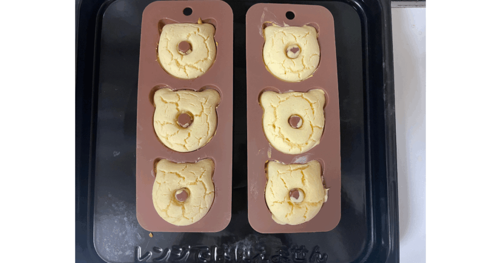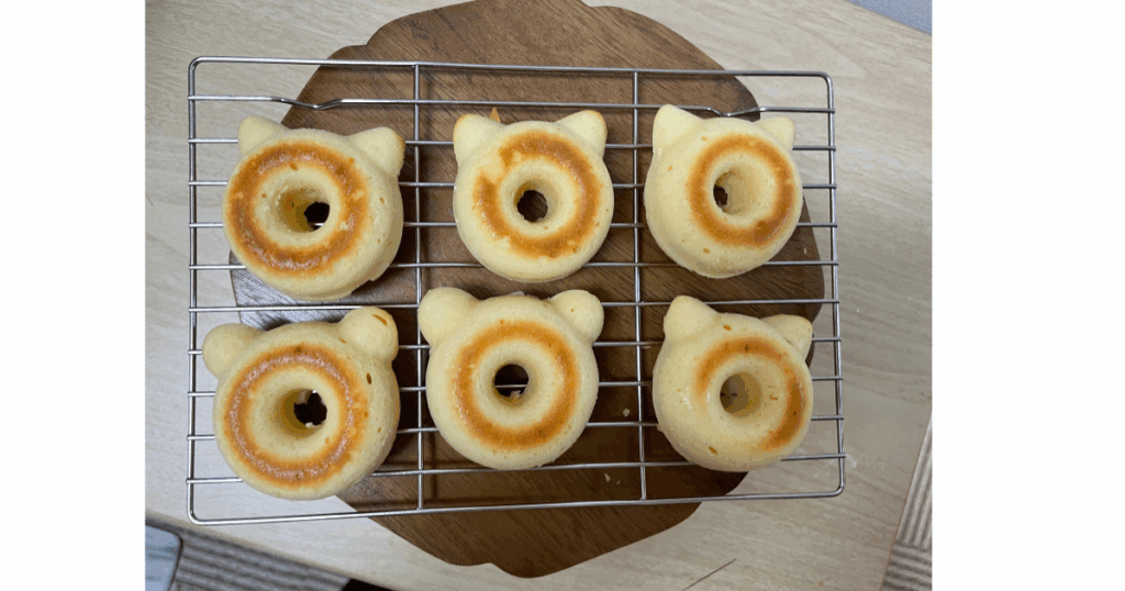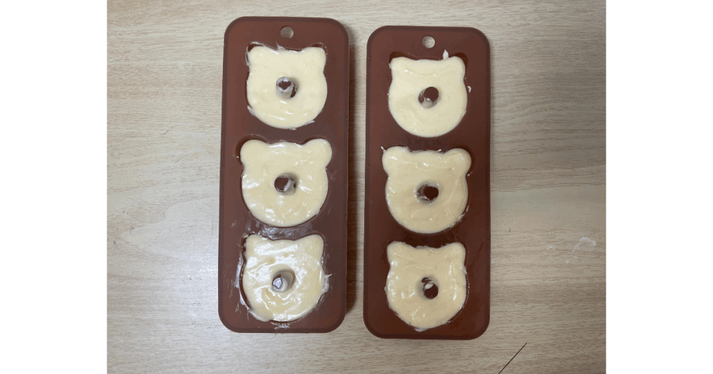ドーナツの型に入れ、170℃で予熱したオーブンへGO!焼き時間は15分が目安ですが、焼きすぎはカチコチの原因ですので表面に焦げ色がついてきたら食べごろの合図かも!
