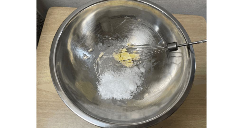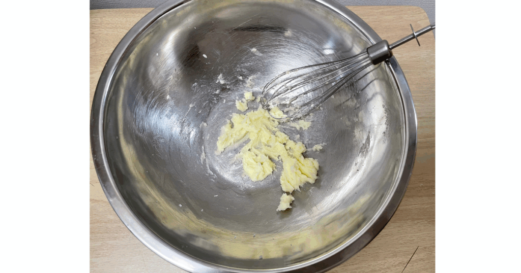 常温に戻った無塩バター20gと砂糖30gをボウルに入れ、よくかき混ぜる!