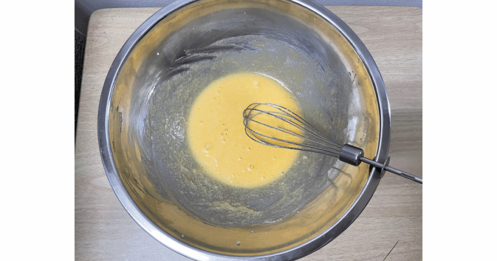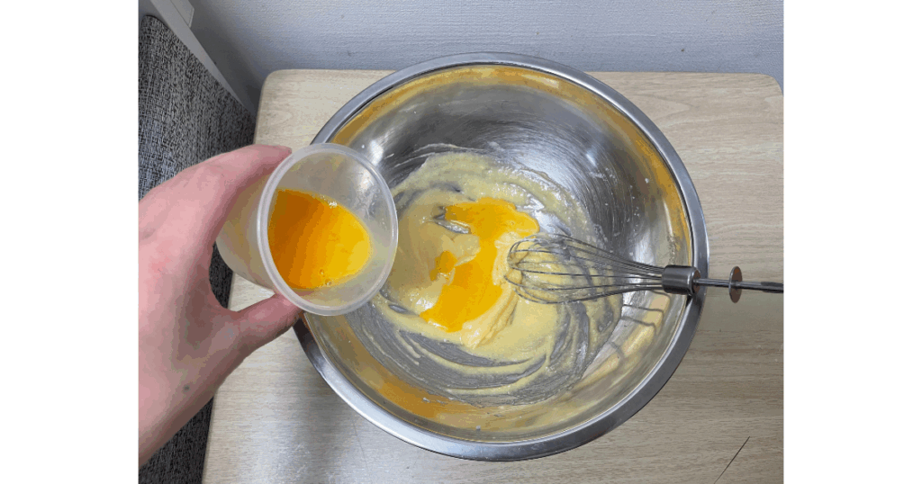 溶いた卵を2~3回に分けてボウルに投入し、よくかき混ぜる!