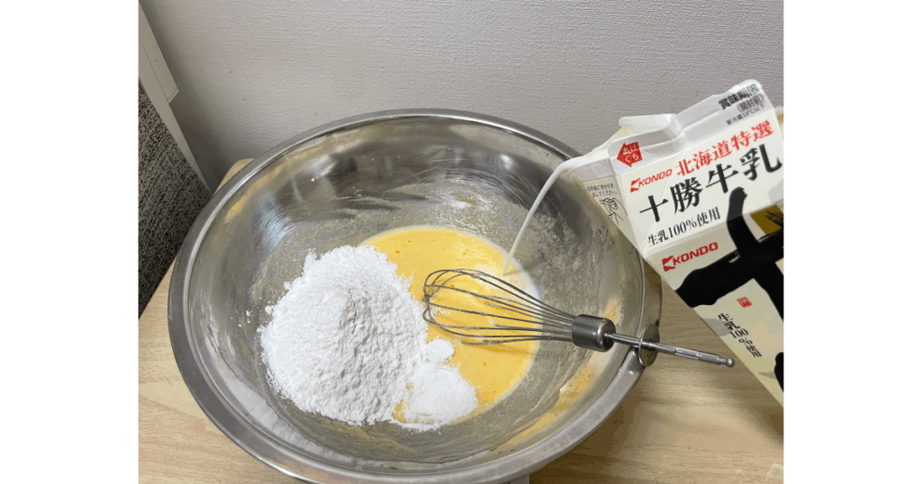 米粉、ベーキングパウダー、牛乳をボウルに入れ、かき混ぜる!ここで重要なのはかき混ぜすぎないこと!混ぜすぎると空気が抜け、ふんわり膨らまなくなってしまいます😢