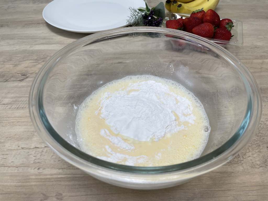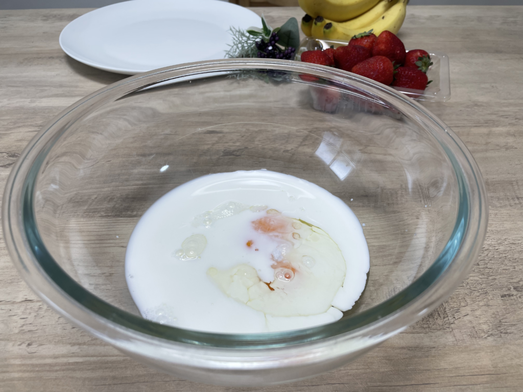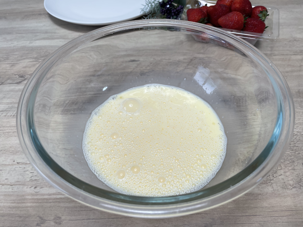 大きめのボウルに、牛乳・卵・砂糖を分量通りに入れ、しっかりと混ぜ合わせます。