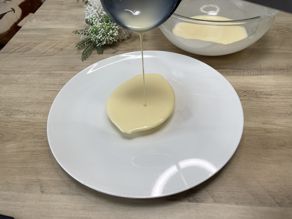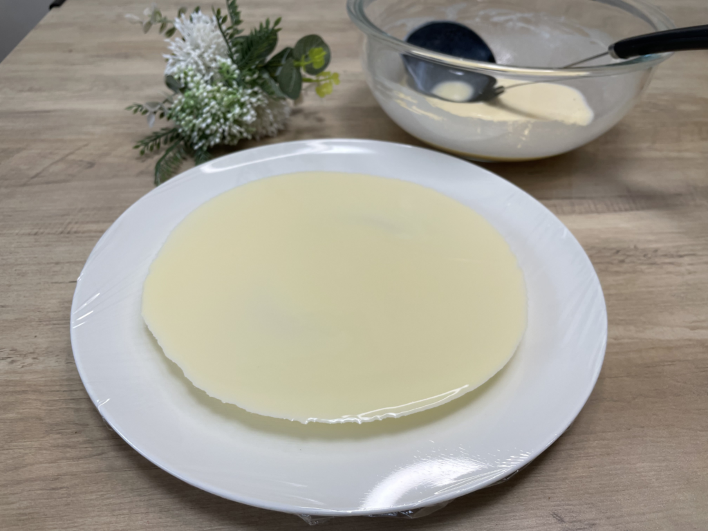 ラップがしっかり張られていない状態で生地を流すと、表面が波打ってしまい、生地の厚さが均一になりません。また、生地を一気に流してしまうと偏りが生じ、取り出す際に破れてしまう原因になります。見た目以上にこの工程は仕上がりに直結するポイントです。