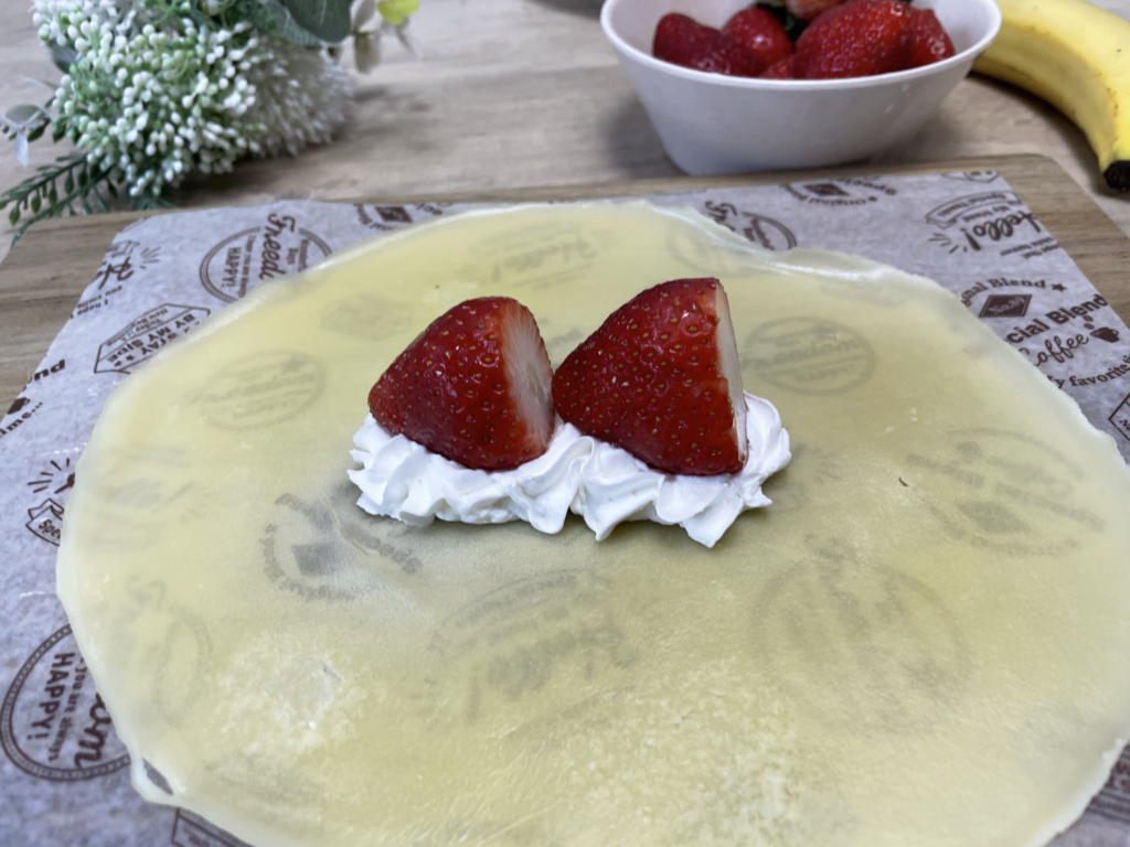 出来上がったクレープの皮にホイップやいちご・バナナなどを乗せて、包みます。