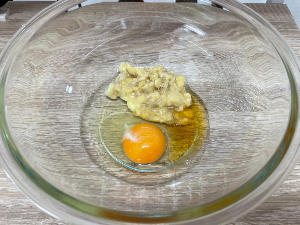 大きめのボウルに、たまご・こめ油・はちみつ・加熱したバナナを入れ混ぜ合わせます。