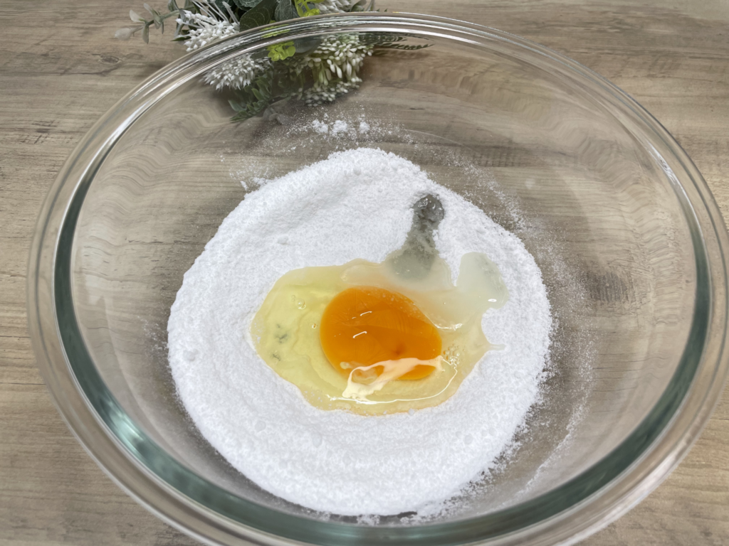大きめのボウルに米粉、砂糖、ベーキングパウダー、たまごをいれ、だまにならないように混ぜます。