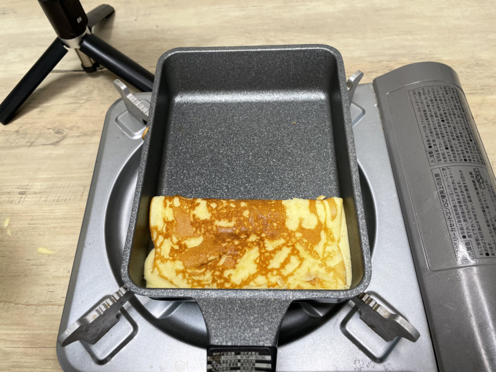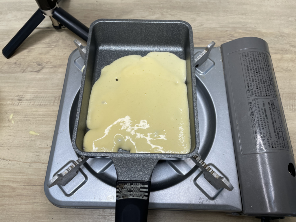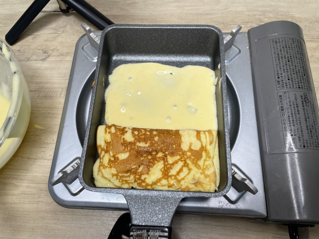 通常の丸いフライパンでも作れますが、生地が広がりすぎてしまい、層をきれいに作るのが難しくなる場合があります。その点、玉子焼き器であれば厚みを出しやすく、初心者の方でも比較的きれいに仕上げやすいと感じました。