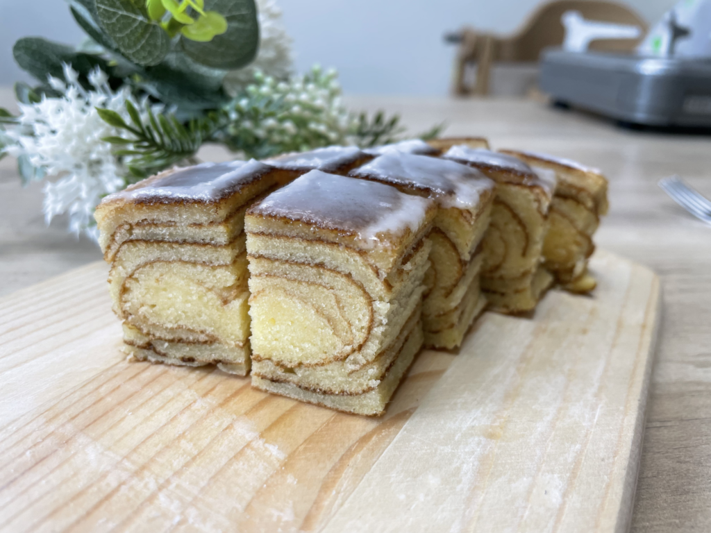 米粉バームクーヘンは一見ハードルが高そうに感じるお菓子ですが、ポイントを押さえれば家庭でもしっかり美味しく仕上げることができます。特に今回のように玉子焼き器を使う方法であれば、生地を均一に広げやすく、初心者の方でも層を作りやすいのが大きなメリットです。火加減や生地の硬さなど、いくつか意識するポイントはありますが、丁寧に作業することで見た目も味も満足できる仕上がりになります。